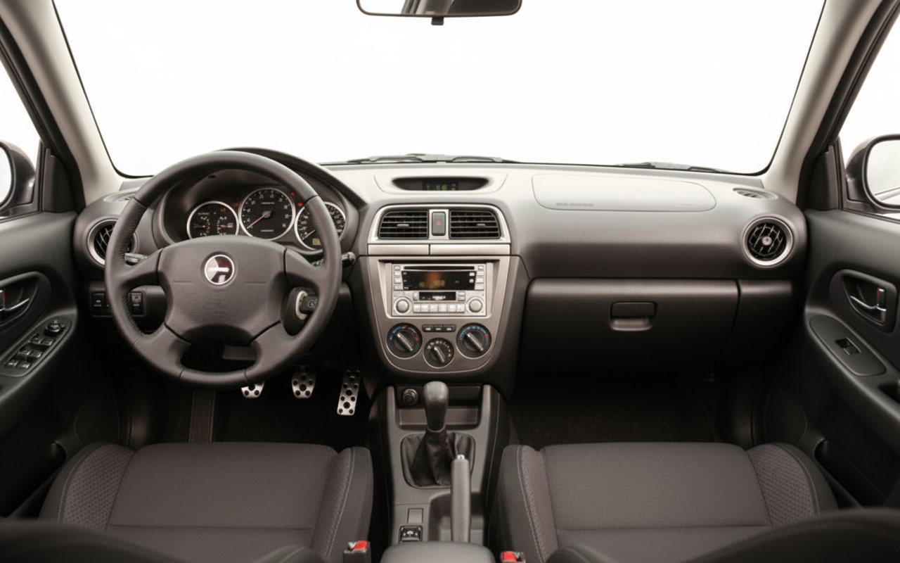 2003年型スバルインプレッサWRXのデザインは、紛れもなくスポーティで機能的です。そのアグレッシブなライン、ボンネットの大きなエアインテーク、リアスポイラーは単なる装飾ではなく、空力性能とラリーカーのイメージに貢献する要素です。4ドアセダンですが、その美学はあらゆる角度からスポーティさを叫んでいます。ロープロファイルタイヤを装着した17インチホイールは、年数を経てもなお魅力的で認識可能なパッケージを完成させています。インテリアでは、機能性が豪華さよりも優先され、優れたグリップを提供するスポーツシートと、あらゆる要素がアクションのために設計されたドライバー志向のダッシュボードが特徴です。