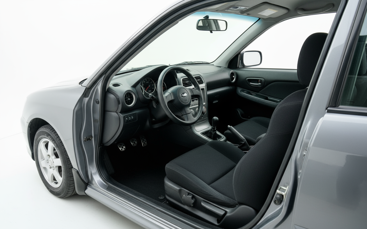 2006年型スバル インプレッサ セダン 2.5T WRXのデザインは、紛れもなくスポーティで機能的です。そのアグレッシブなライン、インタークーラー用の特徴的なエアインテークを備えた堂々としたボンネット、そしてリアスポイラーは単なる装飾ではなく、その性能に貢献する要素です。その美学は一部の人にはやや地味に見えるかもしれませんが、その目的は明確です。空力効率と尊敬を呼ぶ存在感です。内装は豪華さにあふれているわけではありませんが、ドライバーを念頭に置いて設計されており、優れたサイドサポートを提供するシートと、クリアで読みやすい計器類を備えています。それは形よりも機能を優先するデザインですが、同時にスポーツカーの世界で美的アイコンを創造しました。